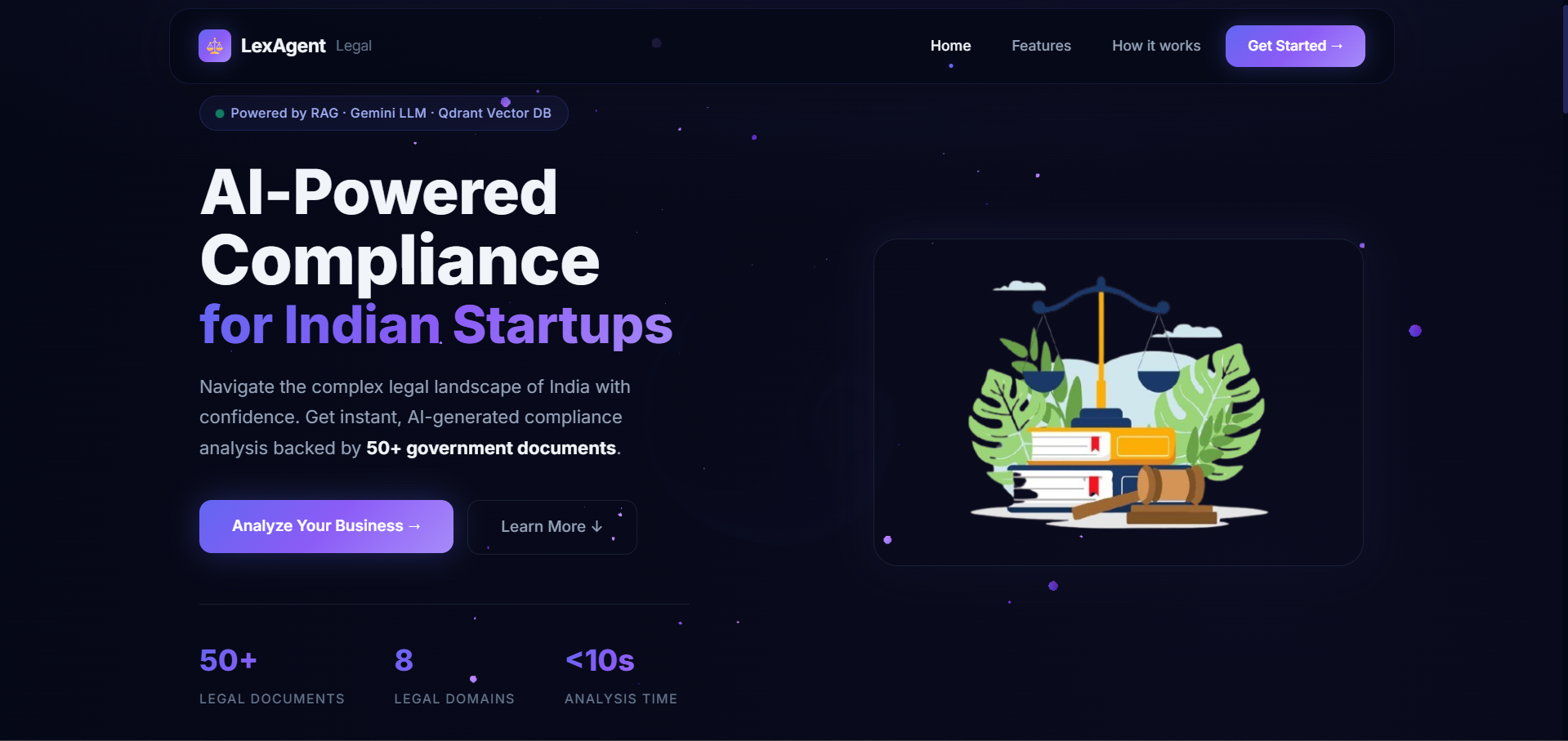 LexAgent is a sophisticated AI-powered compliance assistant designed to navigate the complex landscape of Indian laws and regulations. It utilizes a Retrieval-Augmented Generation (RAG) architecture to provide accurate, context-aware legal advice by querying a vector database of official compliance documents like the Companies Act and IT Act. The platform features a high-end SaaS frontend with smooth animations, a real-time AI thinking window that shows retrieved citations, and the ability to export professional compliance reports. Built with data privacy in mind, it uses local embedding models to ensure sensitive legal queries remain secure while minimizing API costs.